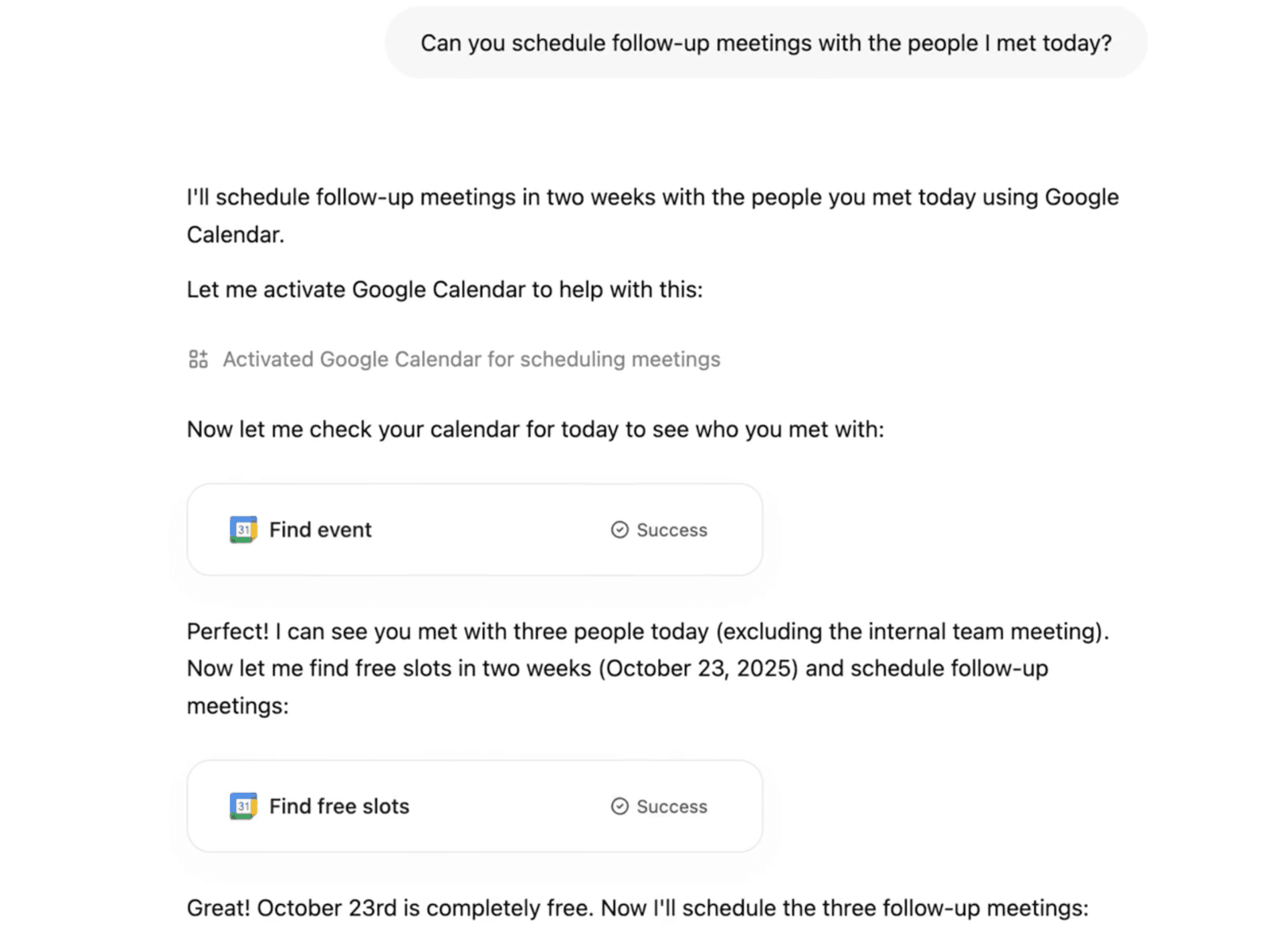 Assistant Astrid reads your calendar and books follow up meetings for each meeting you had today.
