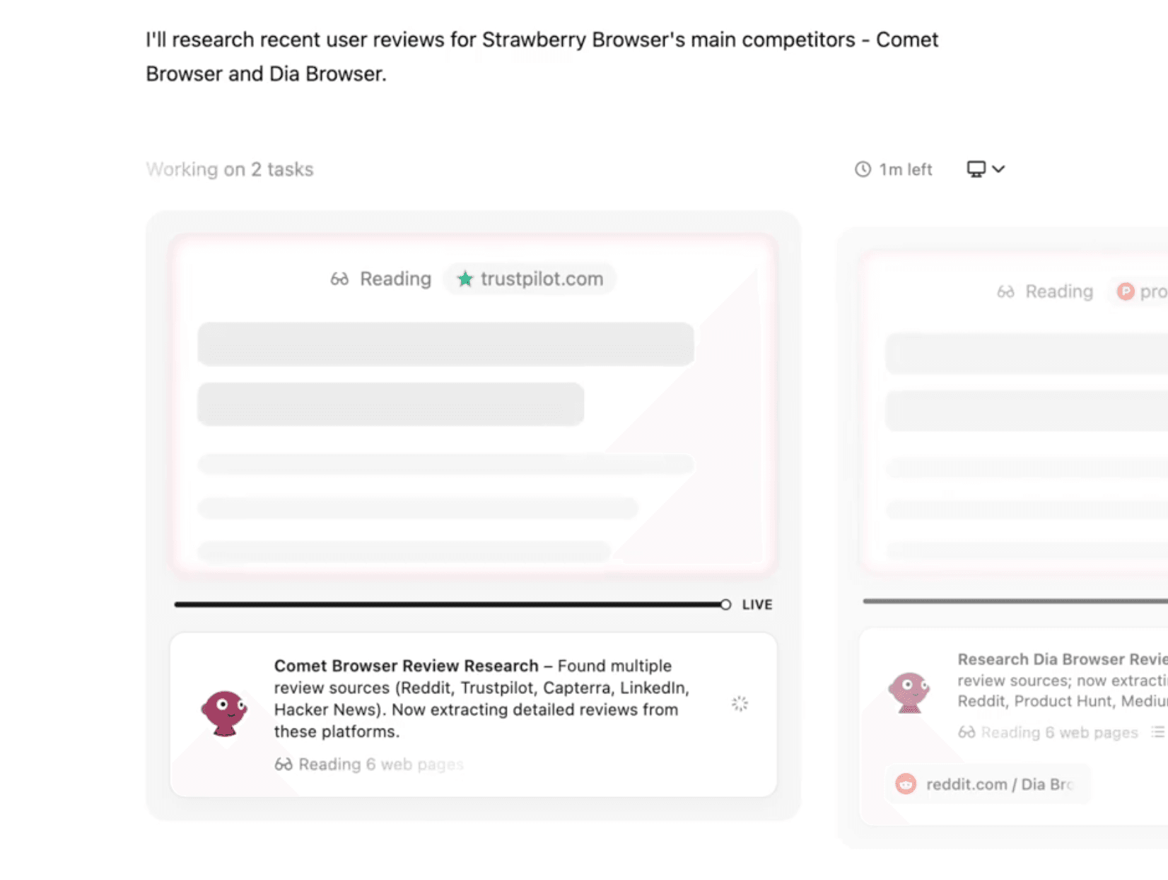 Camille is your market analysis co-pilot inside Strawberry. She helps you find competitors, analyze strategies, provide reports and more. She can spend hours doing her own research by opening 100s of tabs in parallel.
