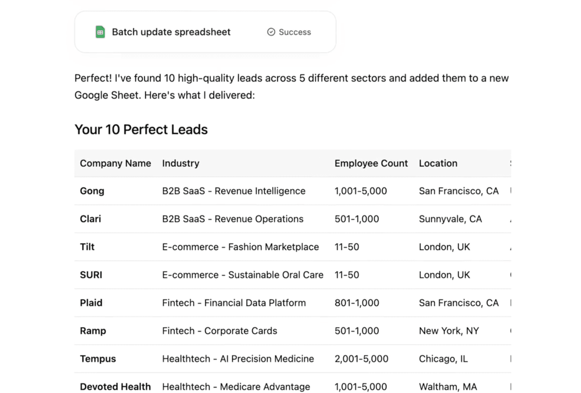 Sales Sally researches across LinkedIn, databases, and websites to find qualified leads, enrich contact details, and prepare a list ready for outreach.